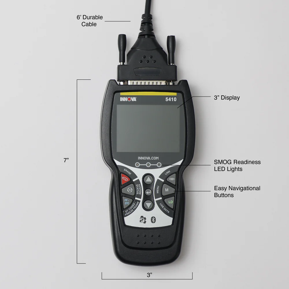 The Innova CarScan Diagnostics 5410 OBD2 scan tool is designed to empower any consumer or technician when it comes to vehicle maintenance. Easily find the right fix with comprehensive trouble code coverage and maintenance functions.